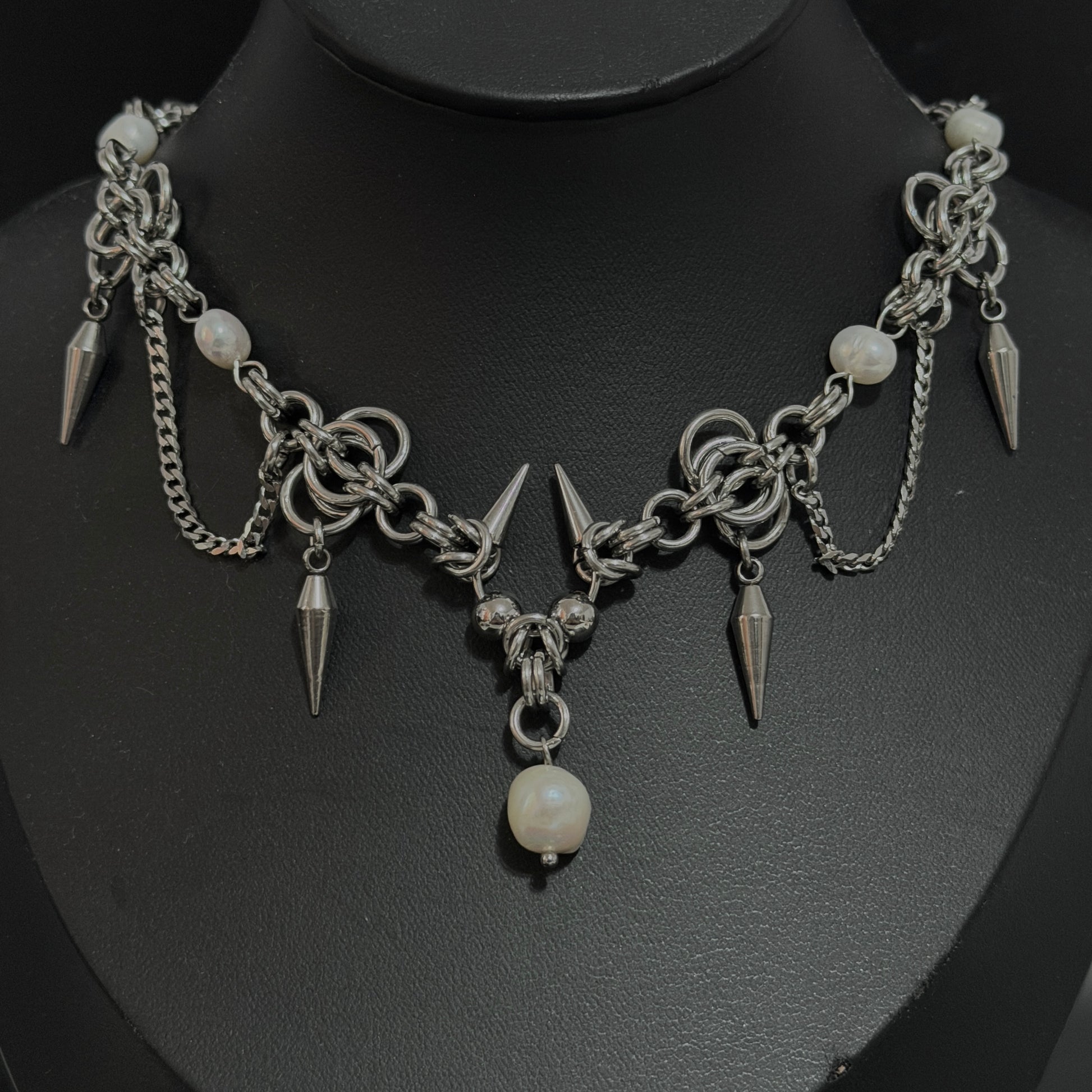 Handmade stainless steel chainmaille necklace with freshwater pearl and spiked adornments.
