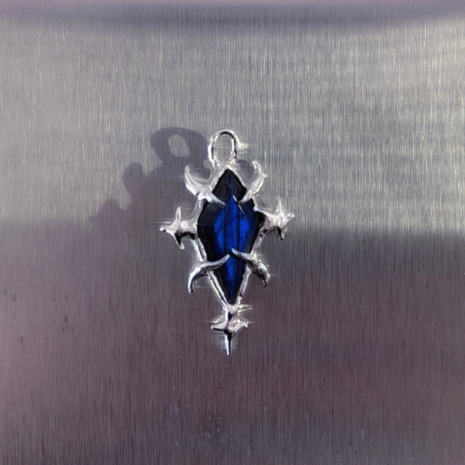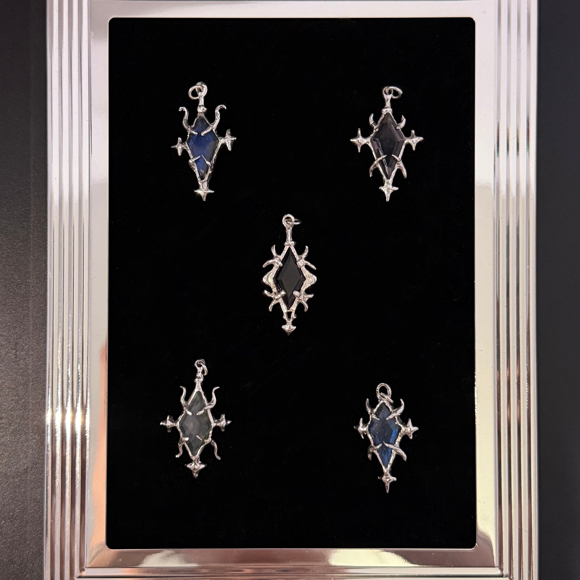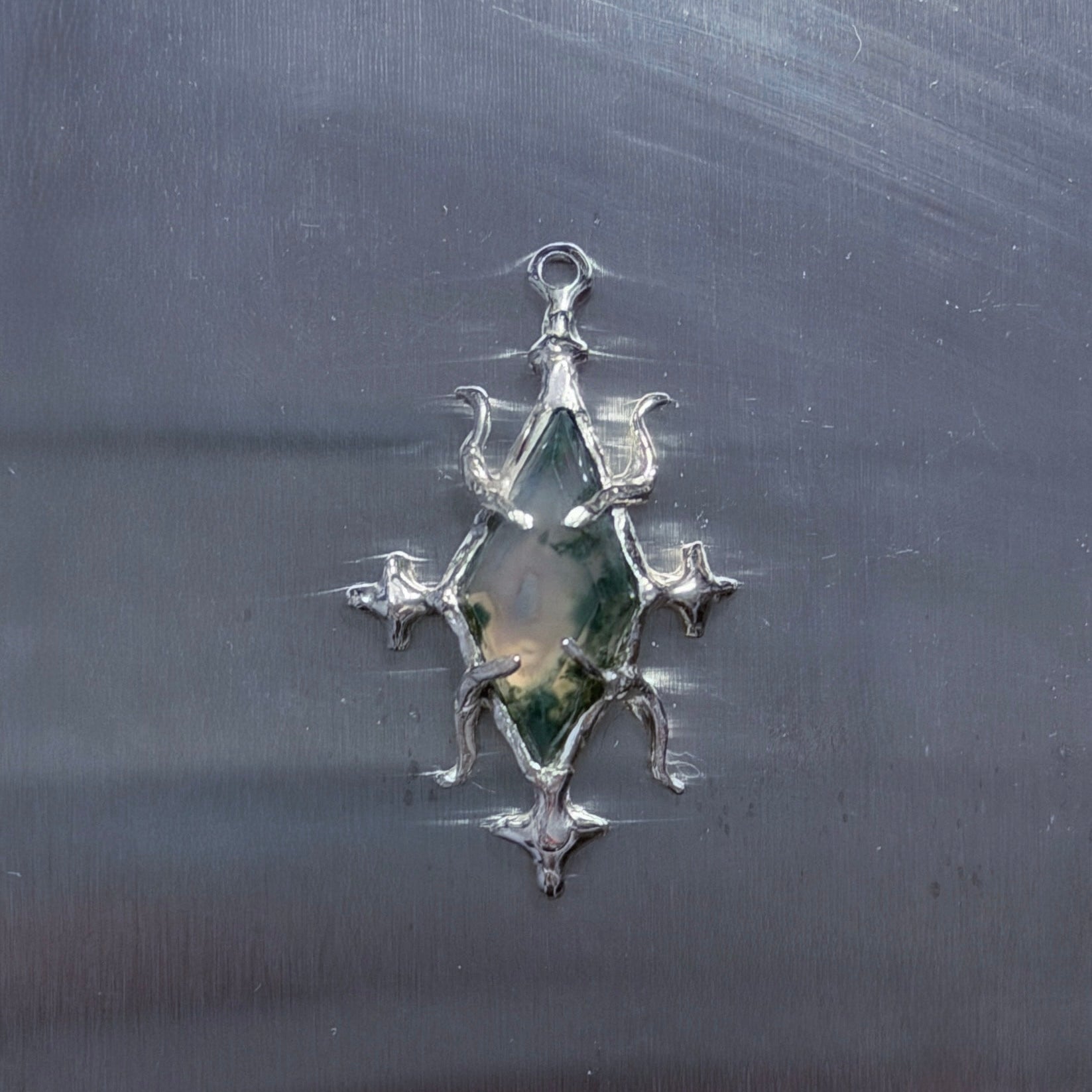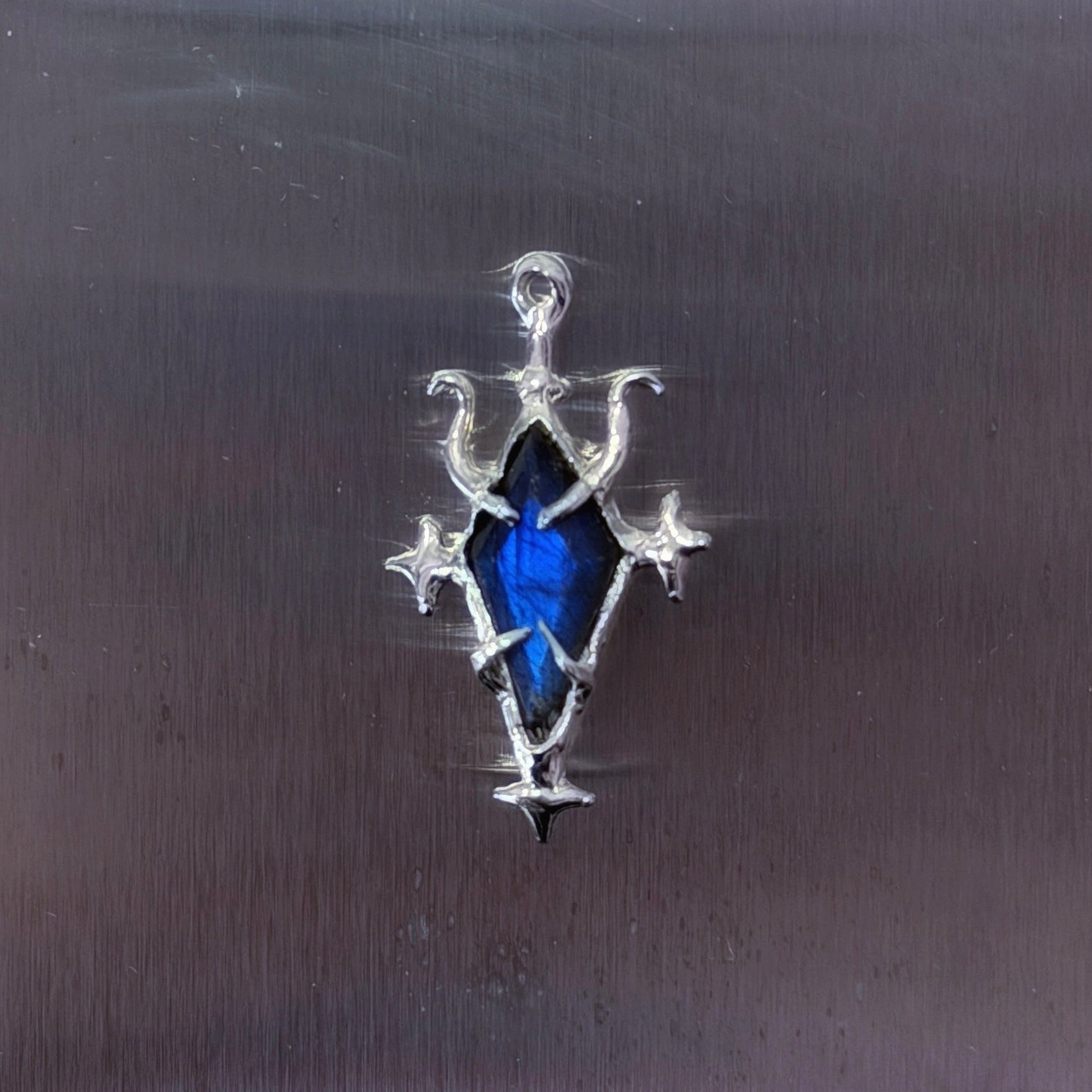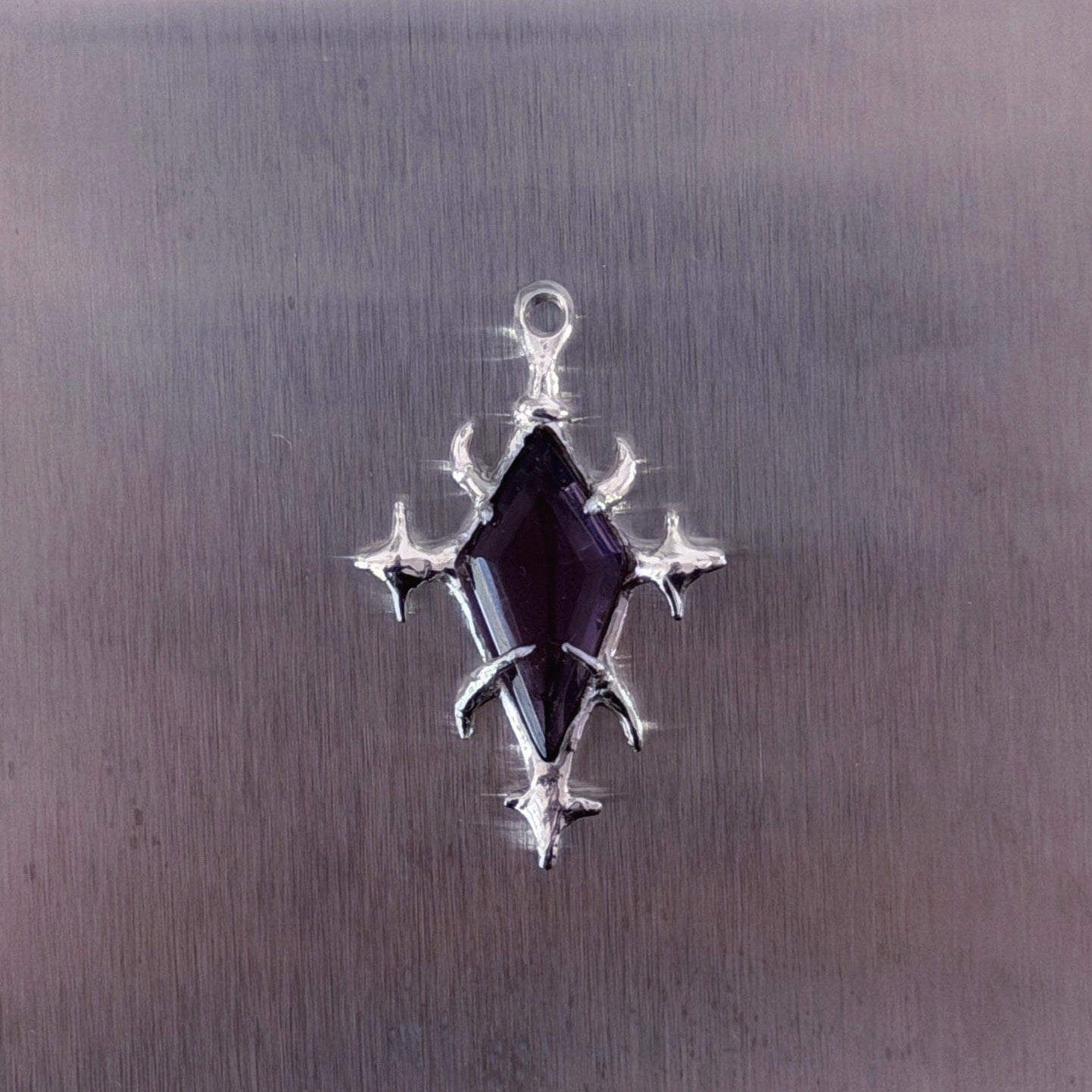 Handmade with recycled 925 sterling silver, these one off pendants feature textured gothic patterning and unique gemstones that pair with the sharp shapes.