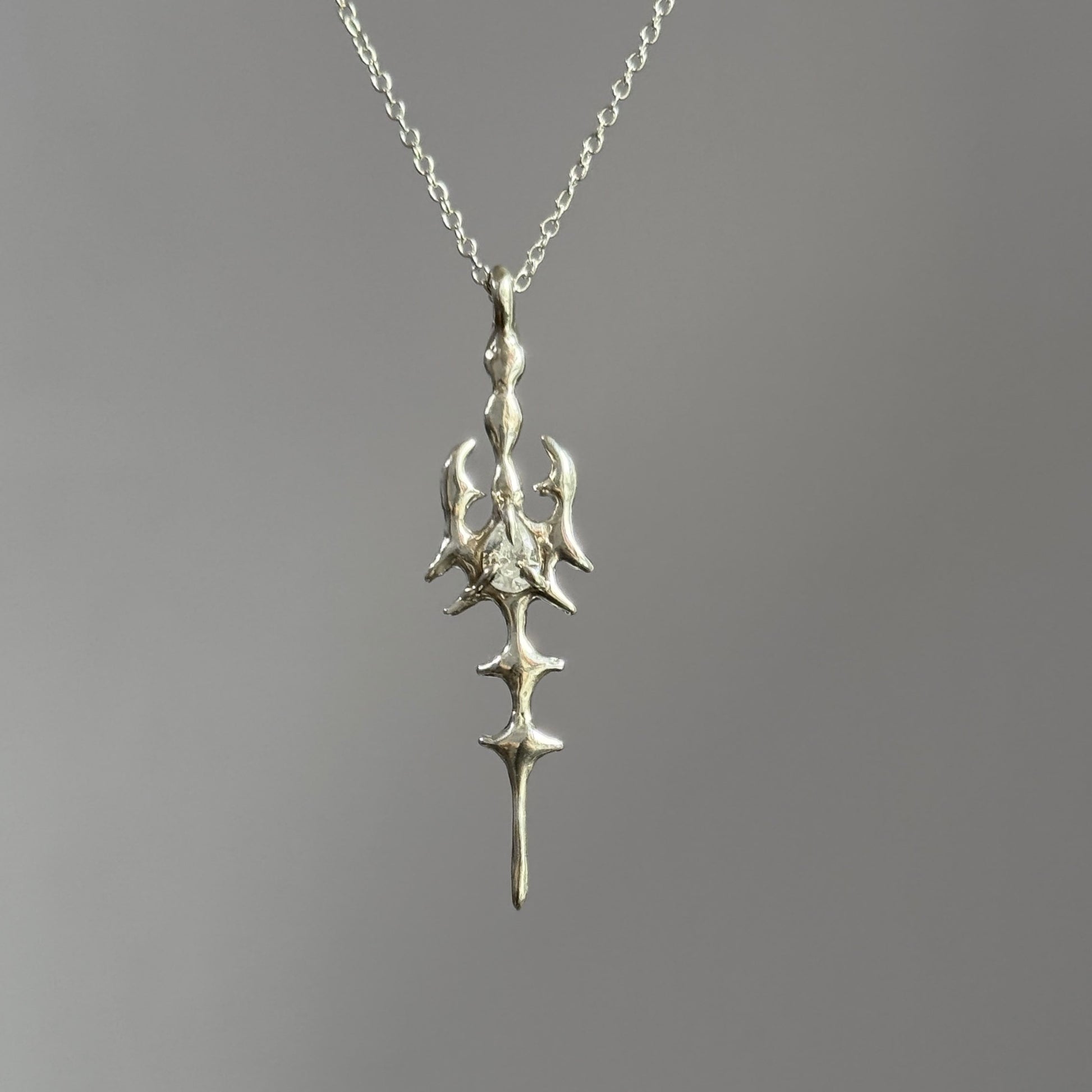 Inspired by the Elden Ring Flameblade, this unique made to order necklace combines a stunning CZ centerpiece with a gothic flame sword frame. Each piece follows the same design a but have their own shape, so each necklace is truly unique.