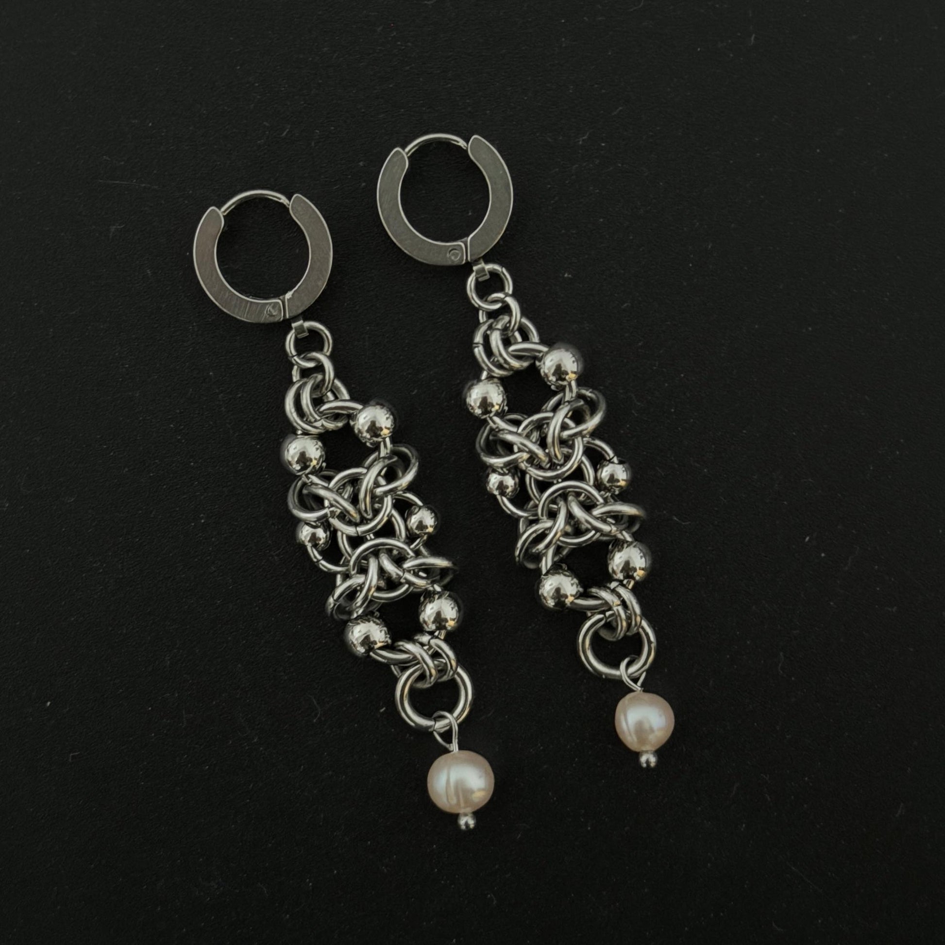 Handmade chainmail earrings with a complex pierced weave and pink freshwater pearl drops.