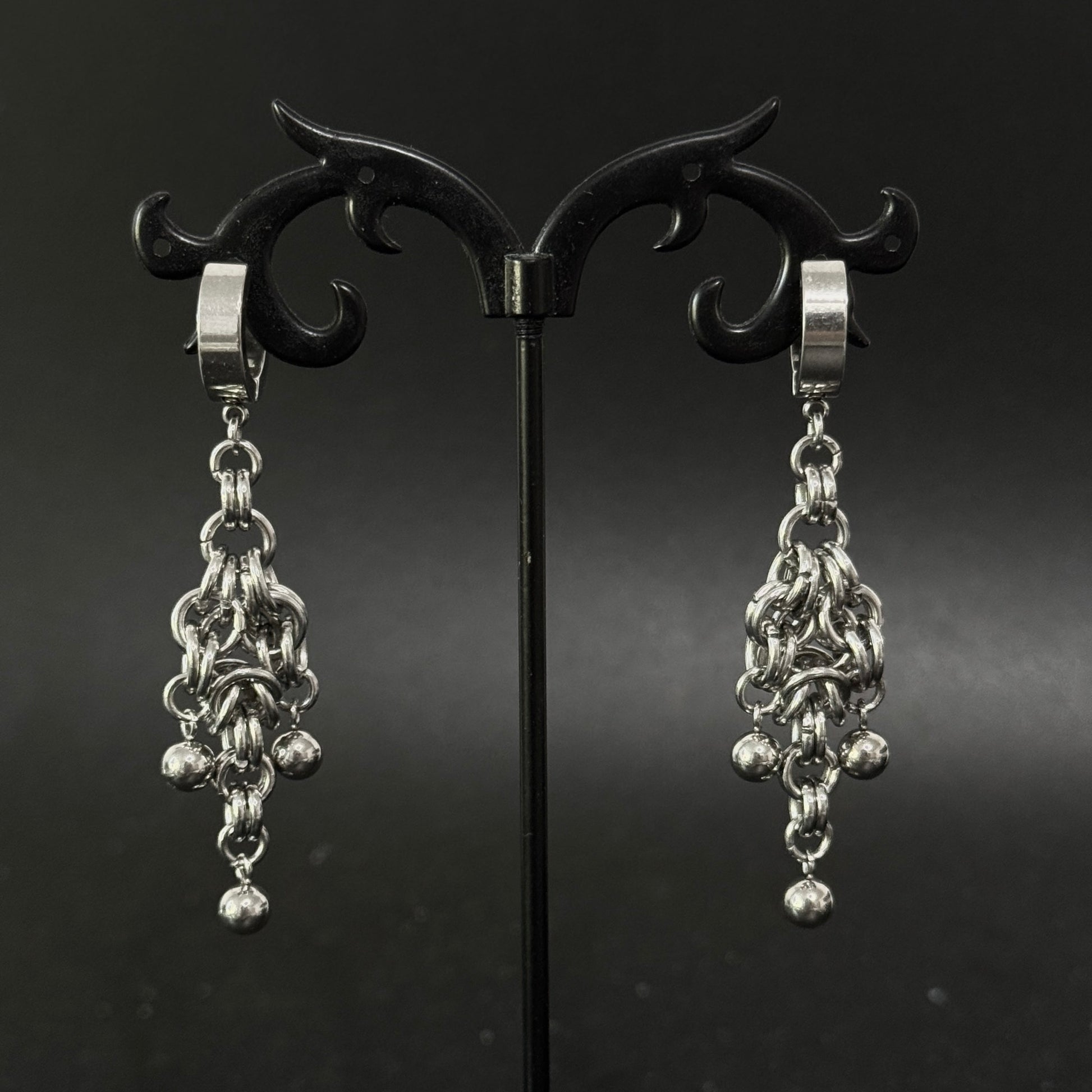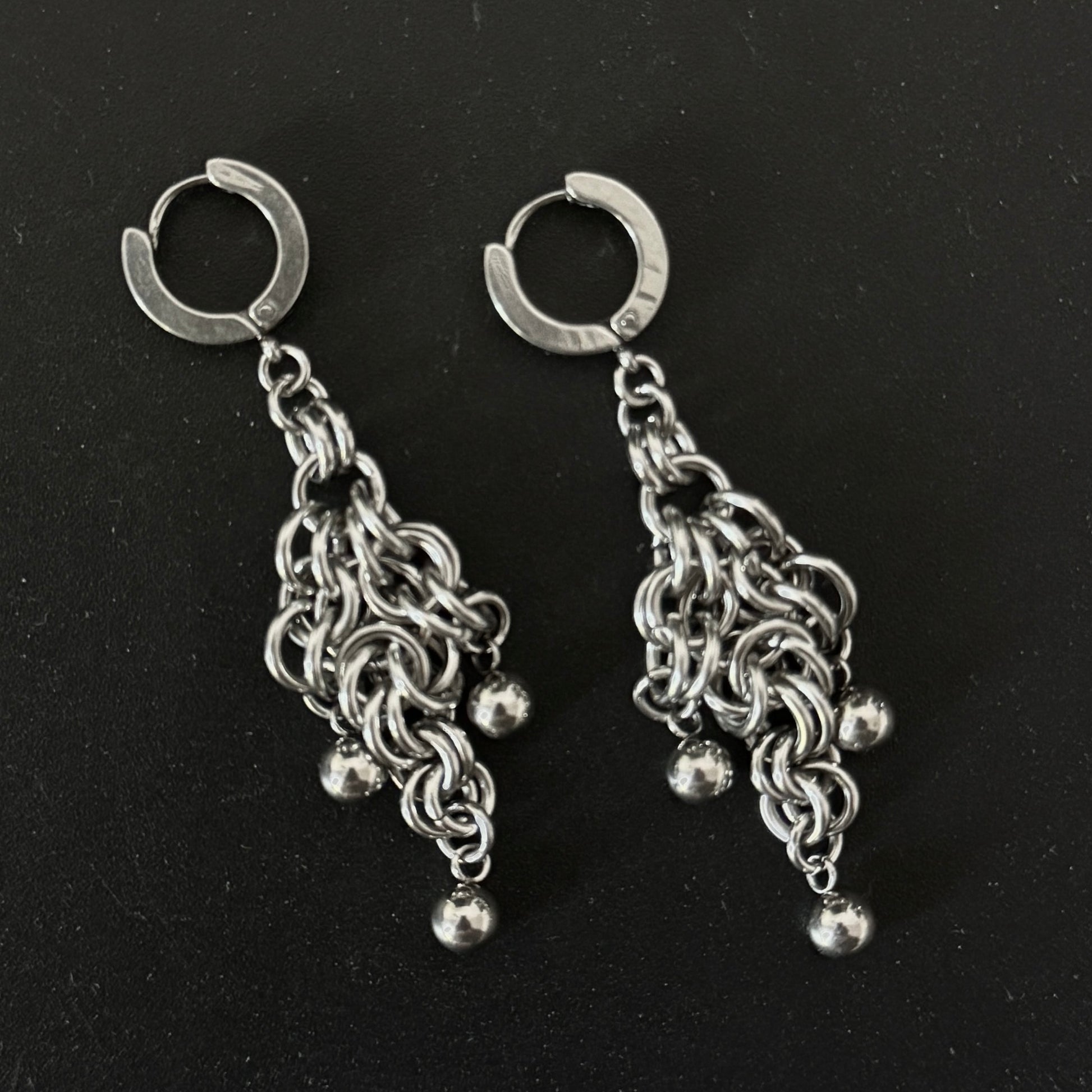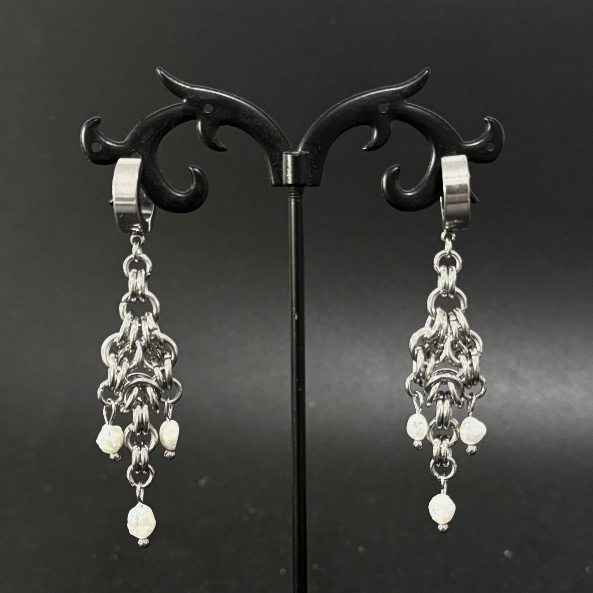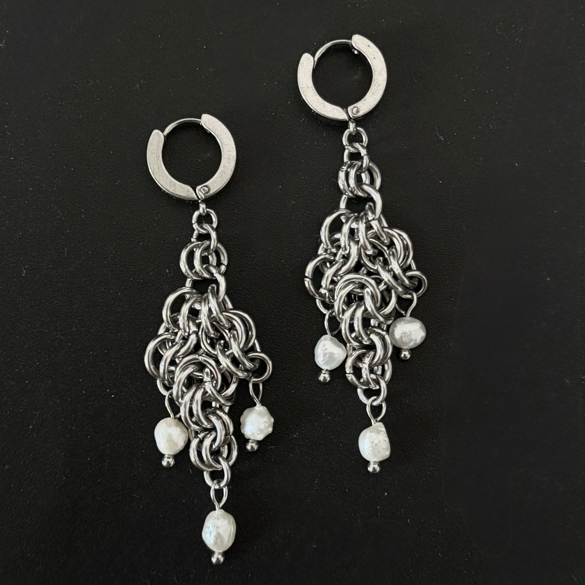 Handmade chainmail earrings with your choice between freshwater pearl or steel adornments.