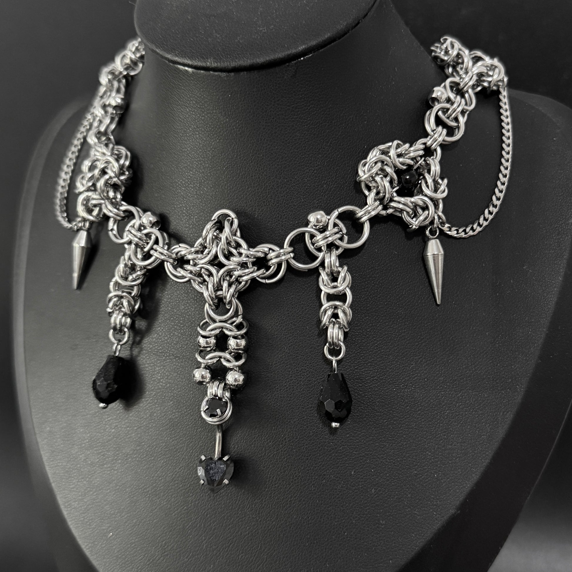 Handmade chainmail necklace inspired by vampiric imagery with your choice of red, black or freshwater pearl accents.